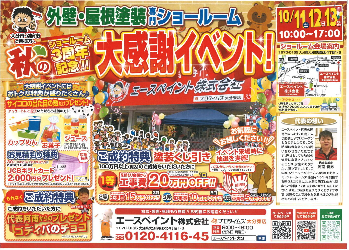 10/11(土)・12(日)・13(月)の3日間 エースペイントショールームにて、秋の大感謝イベントを開催します!