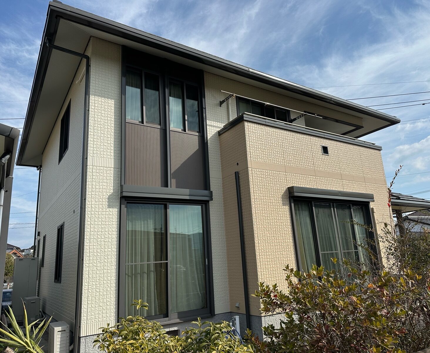 ニュートラルホワイトとミッドビスケットは、落ち着いた温かみのある色です。ベランダ面のミッドビスケットが良いアクセントになり、立体感のある素敵な外観になりました✨