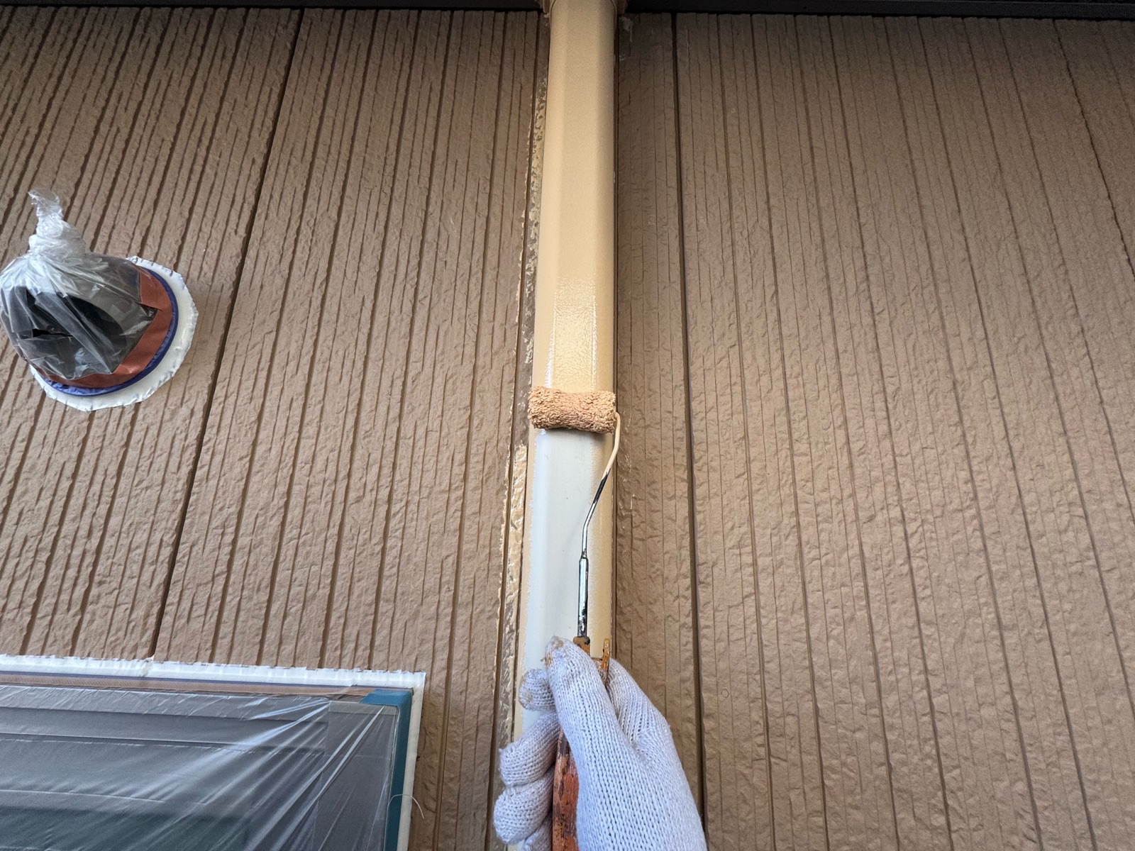 雨樋塗装、室外機カバー塗装 1回目の様子です