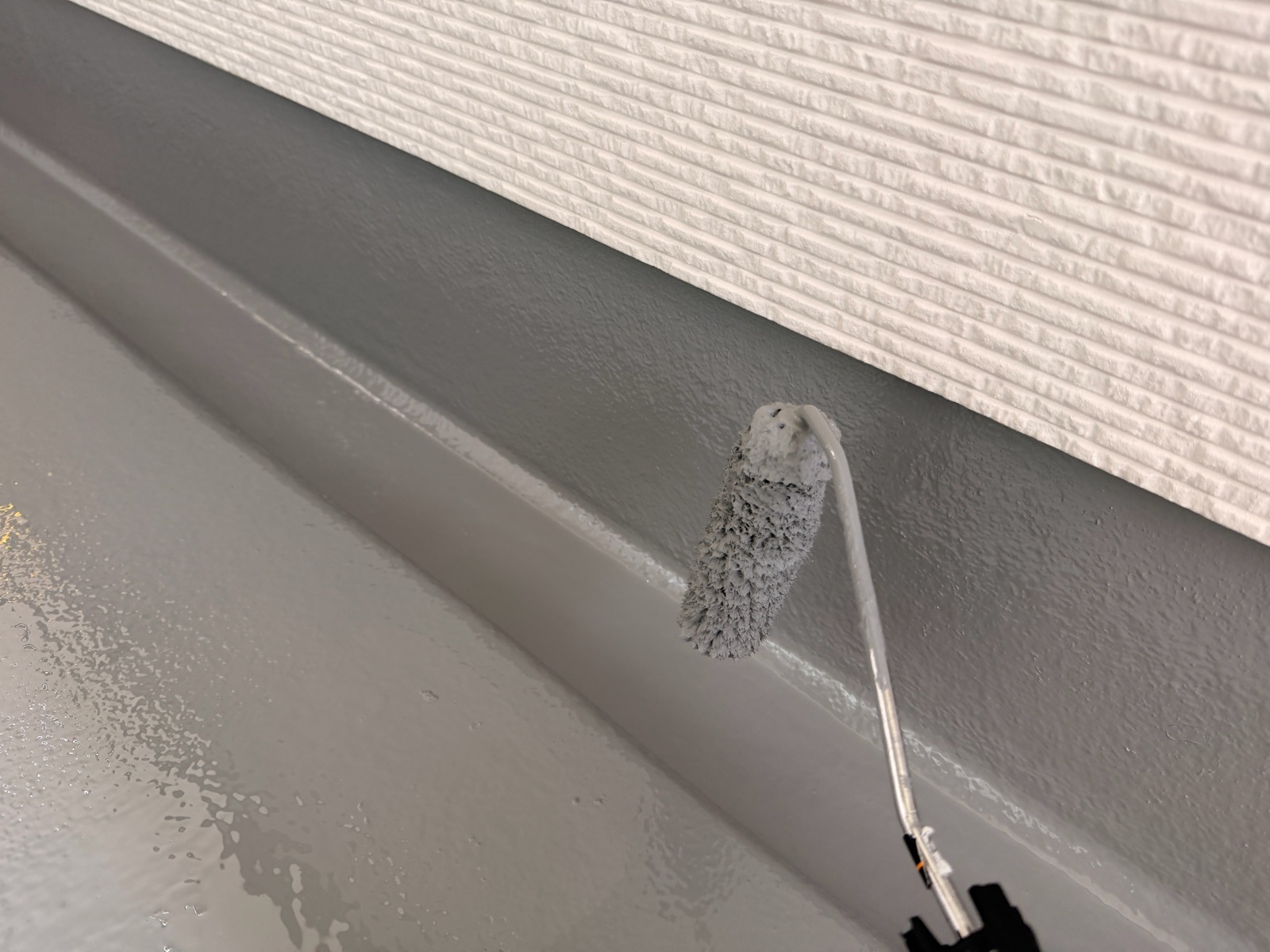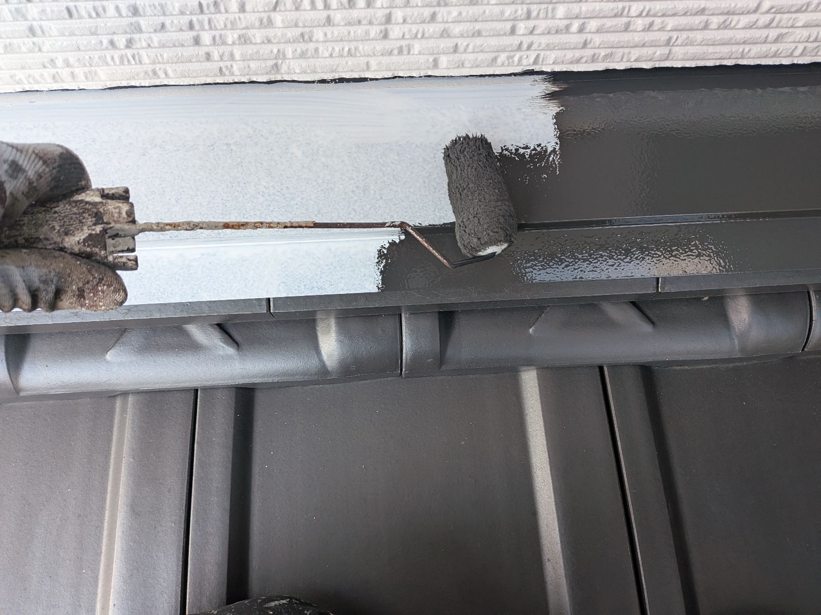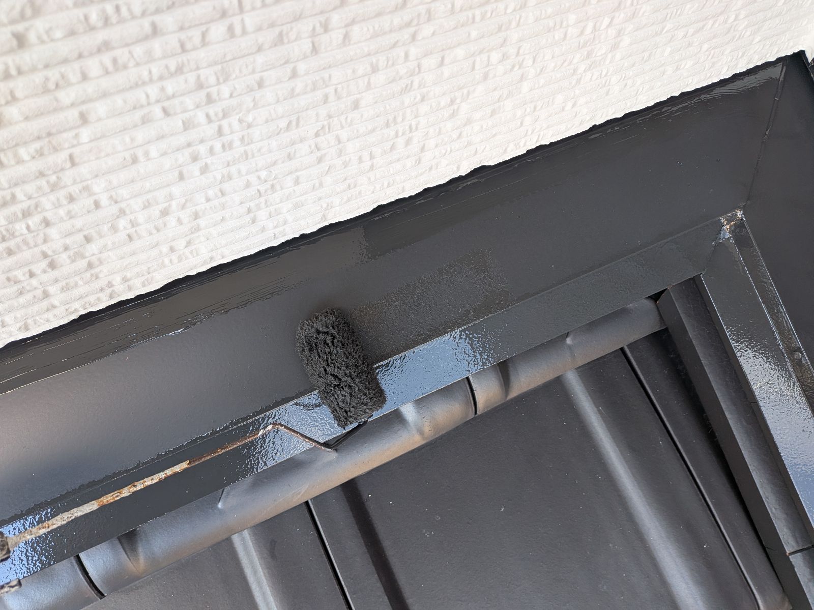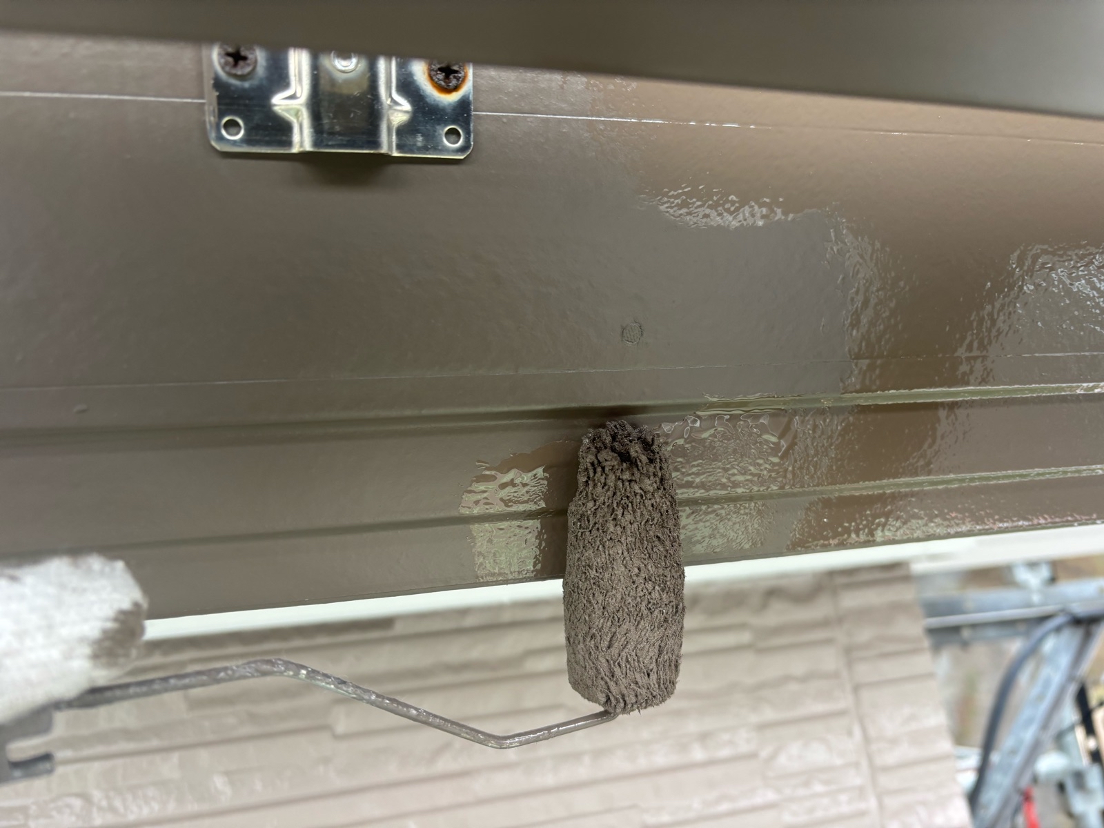 小庇塗装、水切り板金塗装 2回目の様子です