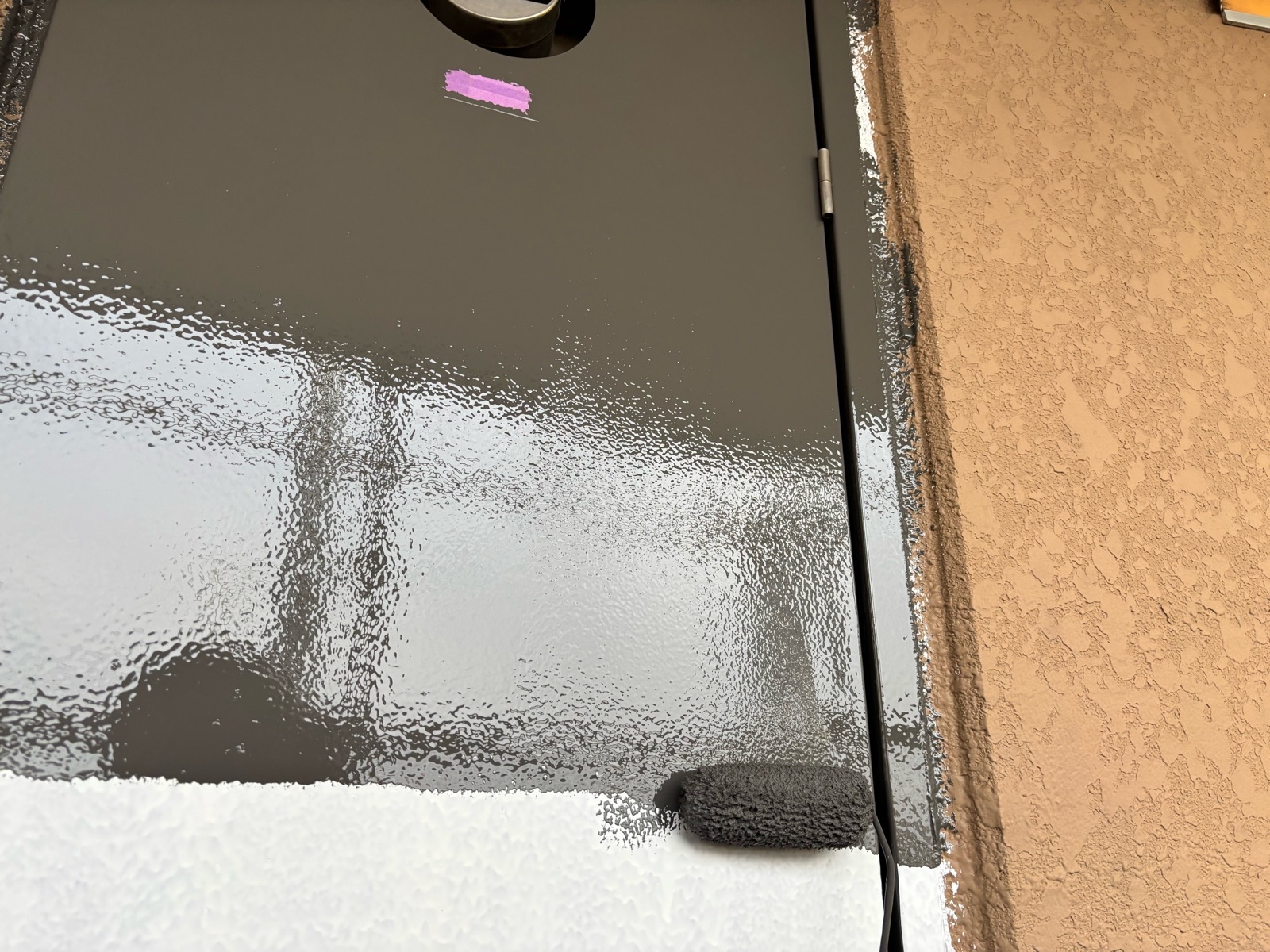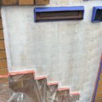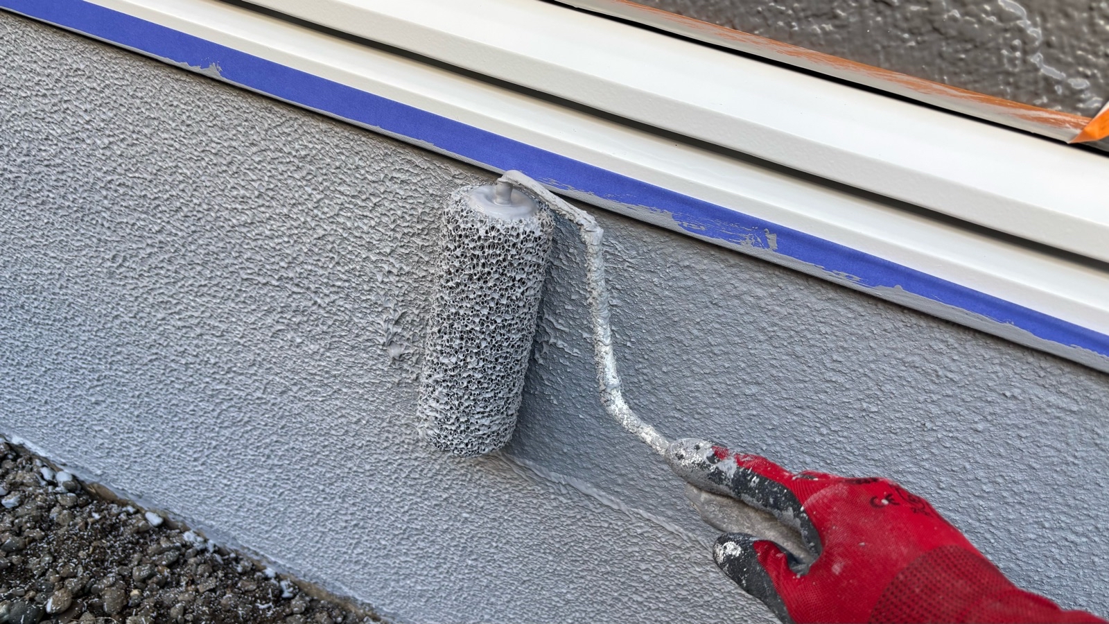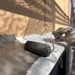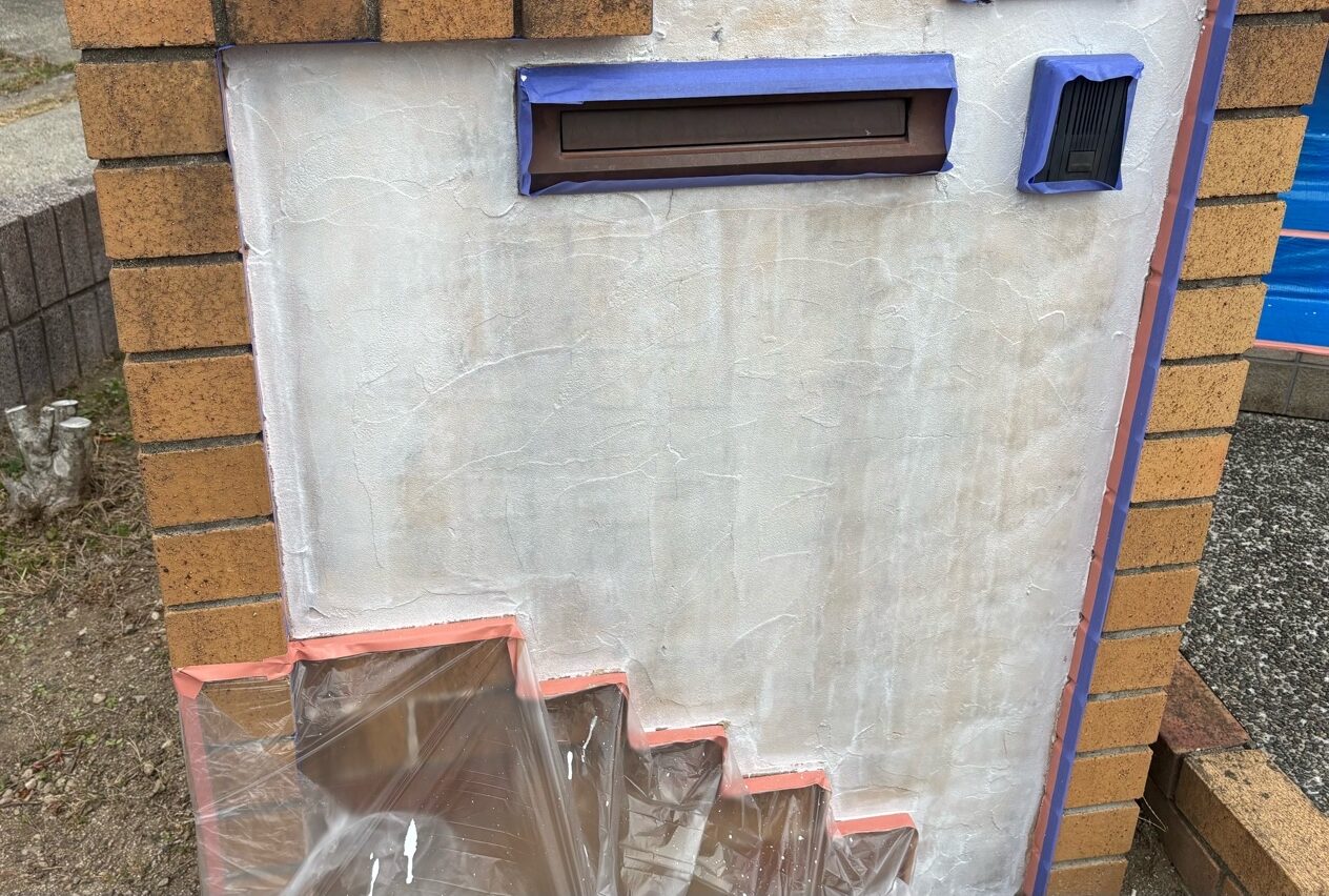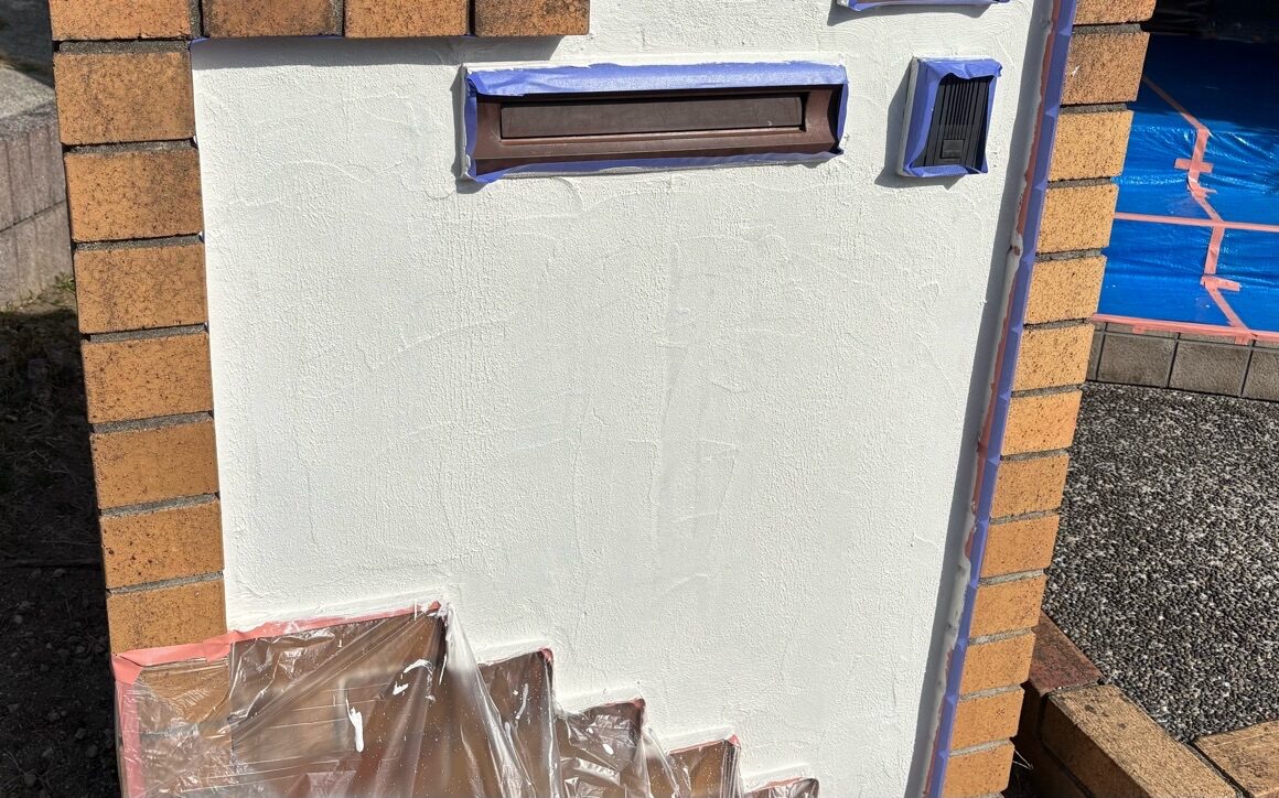 外塀塗装 上塗り1回目の様子です(珪藻土)