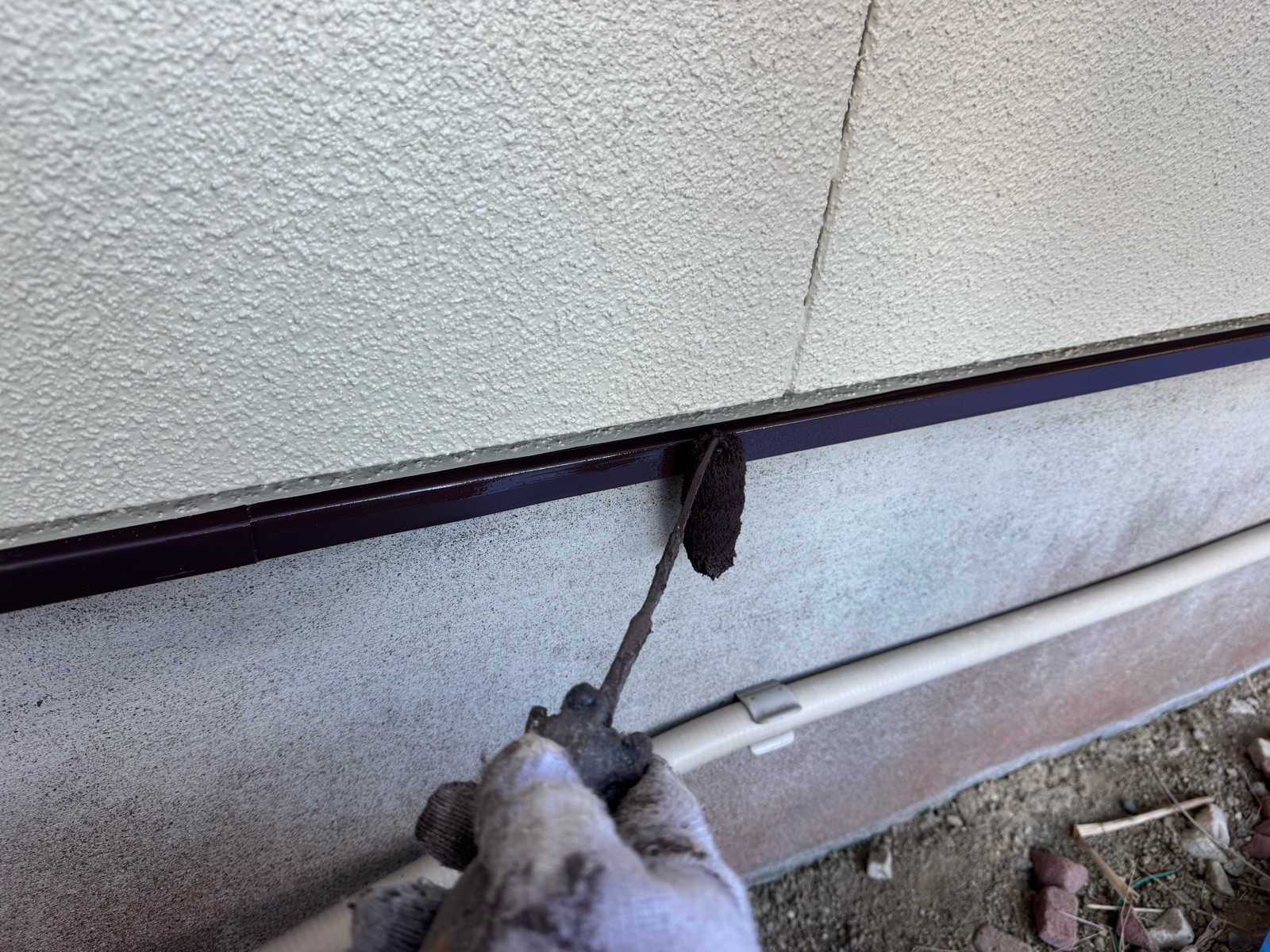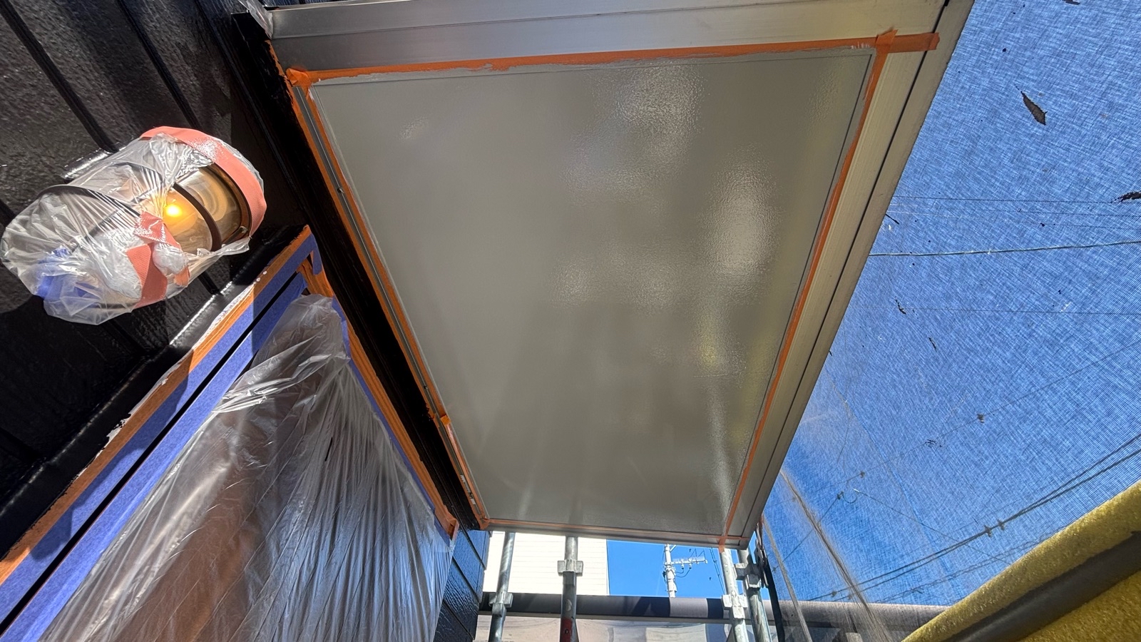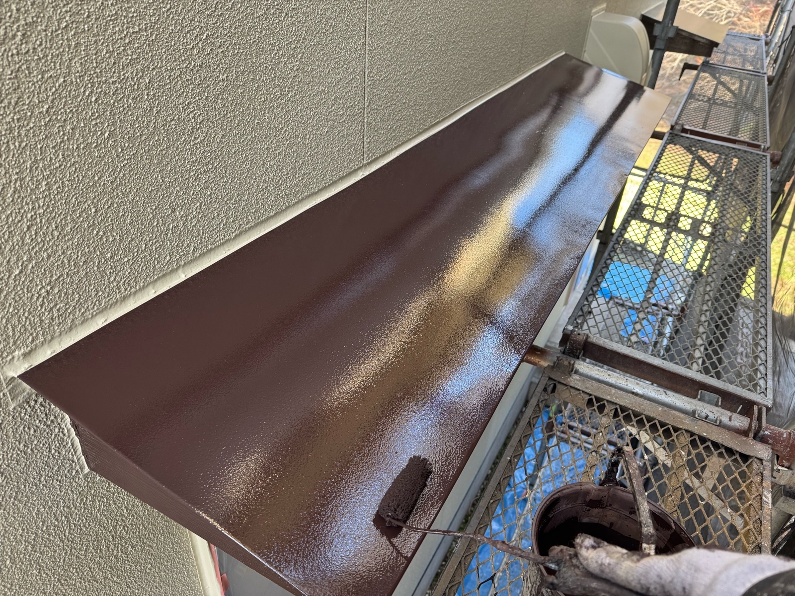 小庇塗装、水切り板金塗装 2回目の様子です